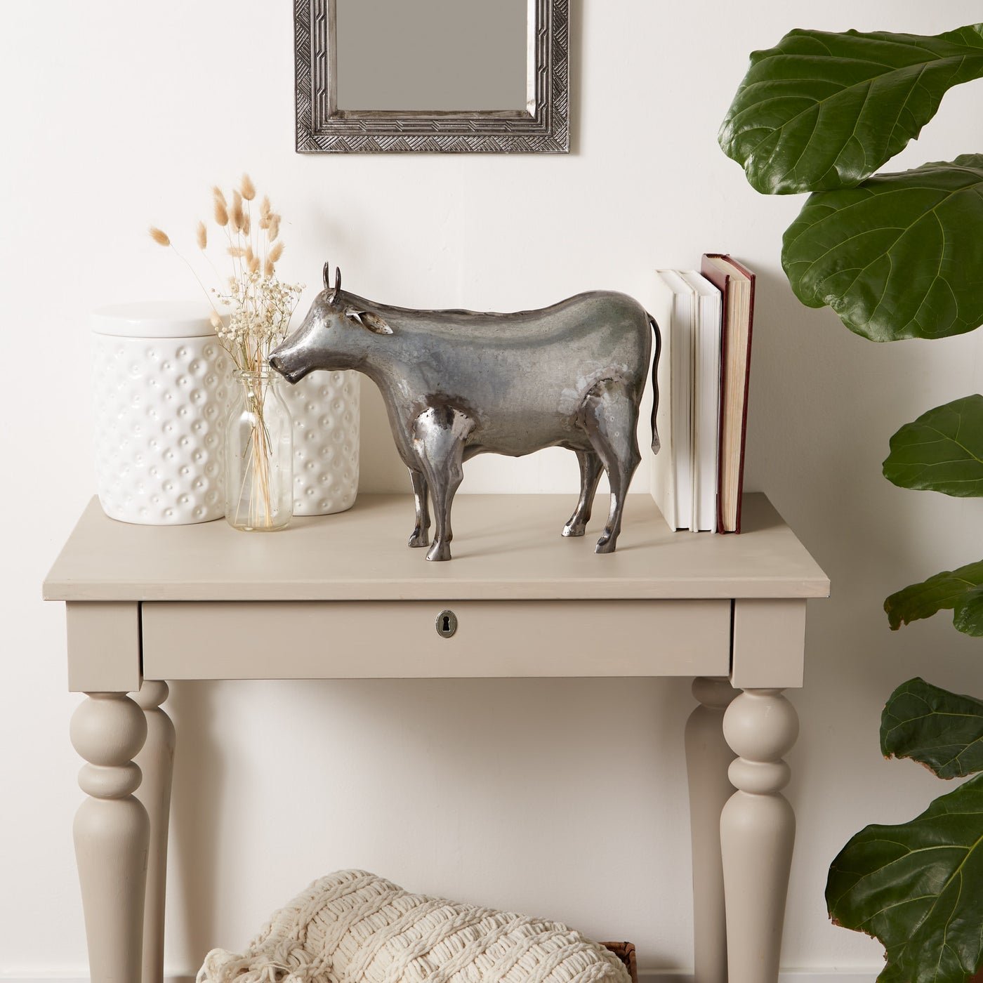 Indoor/outdoor figurine is an adorable cow made out of galvanized metal. This would look charming on a shelf, in a porch, or out in the yard.