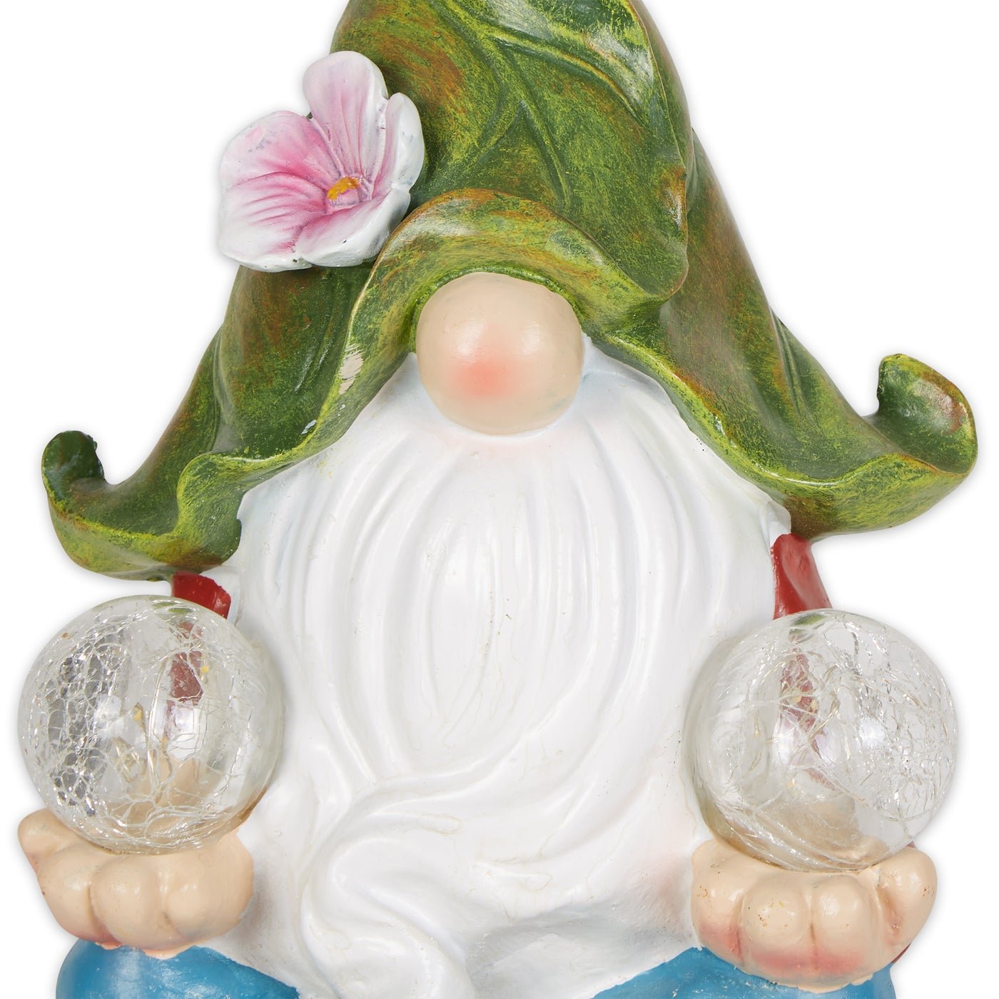 This whimsical gnome holds two clear orbs while meditating on the meaning of life. At nearly a foot tall, this item is sure to draw attention! The solar cell soaks up the sun's rays during the day, and when the sun goes down, the two orbs light up. Perfect for your front yard, garden, or patio.