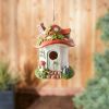 This whimsical bird house is in the shape of a mushroom that looks like a tiny cottage right out of a fairy tale. Clever touches include winding vines on the roof and a little watering can by the front door. It can be hung from its loop or rested on an elevated surface outside. It would also make a fun indoor home decor item. 5 inches in diameter x 6.25 inches tall Polyresin